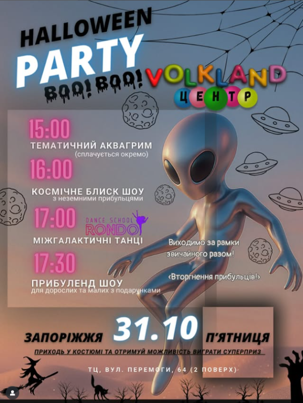 Цьогоріч Гелловін у Volkland обіцяє бути по-космічному яскравим. Організатори підготували шоу у стилі вторгнення прибульців, техно-музику, тематичне меню та фотозону.