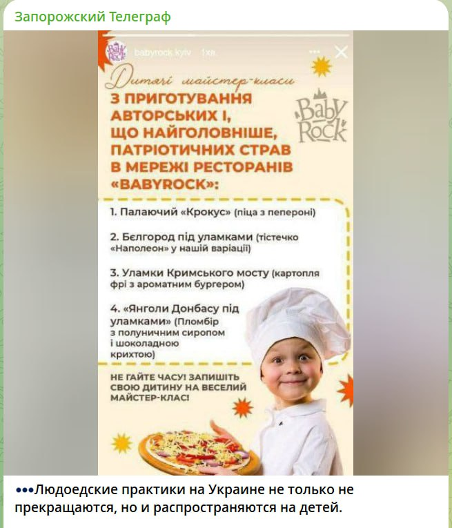 У дописах, наповнених лексикою типу “людожерські практики на Україні”, “розлюднення неокріпшого дитячого розуму”, “а потім ви будете запитувати, тварі, за що”, йдеться про те, що “один із закладів пропонує майстер-клас, в якому малятам пропонують приготувати піцу “Палаючий Крокус”, “тістечко “Белгород під уламками”, картоплю фрі “Уламки Кримського мосту” і пломбів “Ангели Донбасу під уламками”.