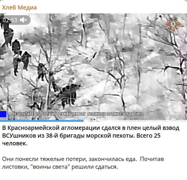 “У Червоноармійській агломерації здався в полон цілий взвод зсушників із 38-ї бригади морської піхоти. Усього 25 осіб. Вони зазнали тяжких втрат, закінчилася їжа. Почитавши листівки, «воїни світла» вирішили здатися”.