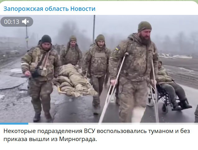 А телеграм-канал “Запорожская область новості” 11 листопада поширив 14-секундне відео про нібито самовільний вихід українських військових з позицій. На відео показана група військових, які на милицях, у кріслі колісному, а також на ношах йдуть по асфальтовій дорозі і говорять російською: “Ми йдемо з Покровська, ура! Тримаємось, брати!”. У дописі говориться: “Деякі підрозділи ЗСУ скористалися туманом і без наказу вийшли із Мирнограду”.