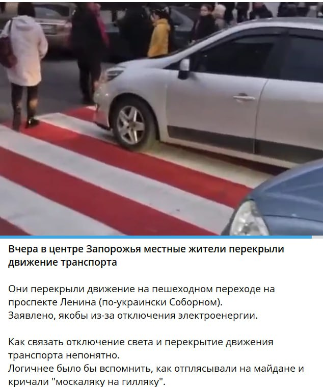 Так, у першому дописі від 14 жовтня говориться: “Вчора у центрі Запоріжжя місцеві жителі перекрили рух транспорту. Вони перекрили рух на пішохідному переході на проспекті Леніна (українською Соборною). Заявлено нібито через відключення електроенергії. Як пов’язати відключення світла та перекриття руху транспорту, незрозуміло. Логічніше було б згадати, як танцюють на майдані та кричали “москаляку на гілляку”. Тут якраз і є прямий причинно-наслідковий зв’язок, але чомусь вони досі не розуміють. Або вже розуміють?”.