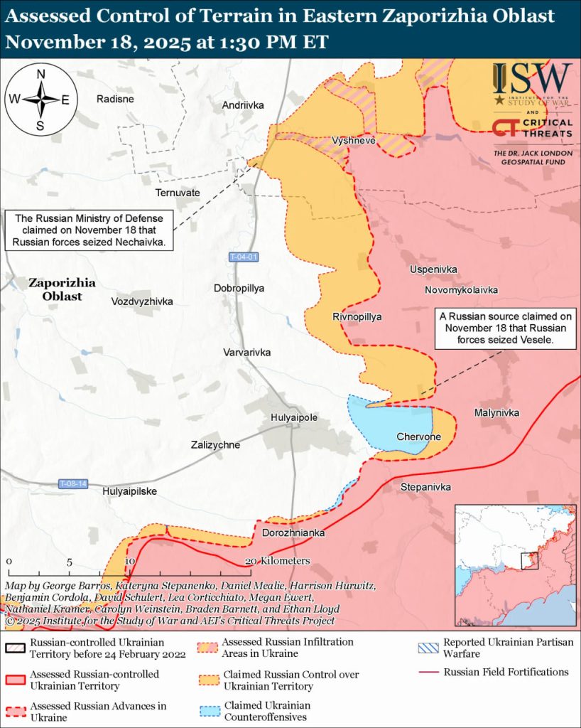 Водночас російські війська продовжують безуспішні атаки на Гуляйпільському напрямку, діючи невеликими групами піхоти та зазнаючи втрат під ударами українських дронів і артилерії. Російські підрозділи атакували північніше Гуляйполя – поблизу Добропілля, Рівнопілля, Яблукового, а також на сході – біля Веселого, Високого та Затишшя. Водночас українські сили контратакували біля Відрадного та Солодкого.