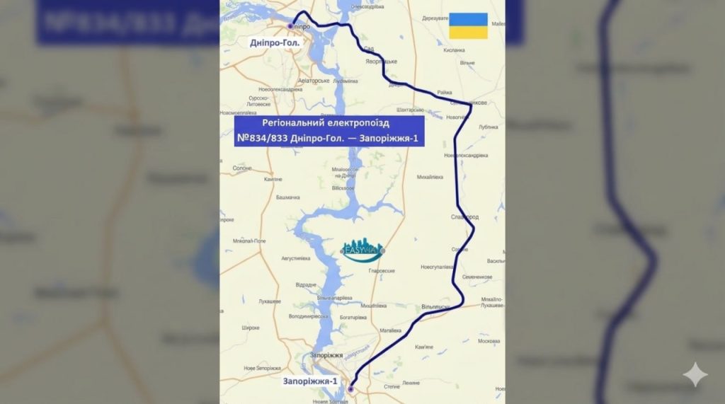 Електропоїзд №834 вирушає з Дніпра о 07:08 і прибуває до Запоріжжя о 09:36. Дорога триватиме 2 години 28 хвилин.