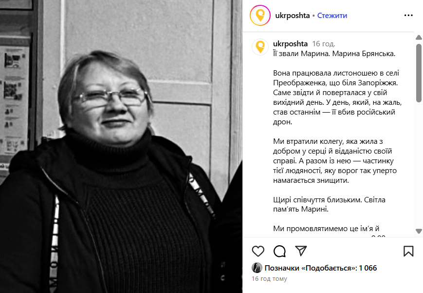 У селі Преображенка Запорізької області під час російського обстрілу загинула Марина Брянська, листоноша “Укрпошти”.