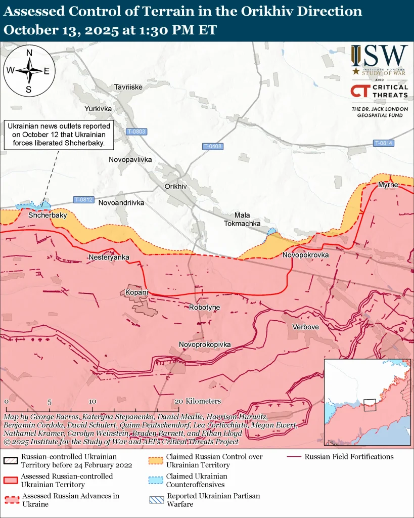 Водночас українські війська просуваються на заході області. 12 жовтня представники Сил оборони заявили, що звільнили Щербаки (західніше Оріхова) та частково Степове, де раніше заявляли про російський контроль.