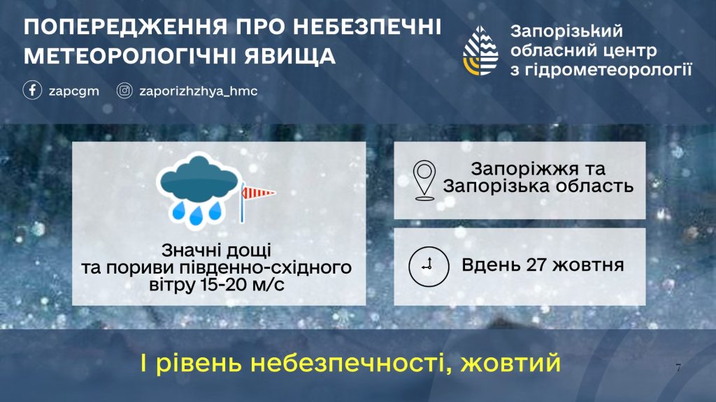 Сьогодні вдень, 27 жовтня, у Запоріжжі та Запорізькій області прогнозують значні опади та пориви південно-східного вітру 15–20 м/с. Синоптики оголосили перший рівень небезпечності, жовтий.