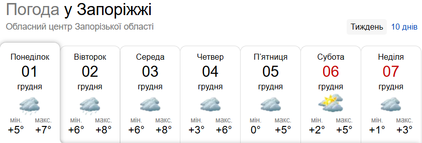 5 грудня хмарна завіса не покине Запоріжжя протягом усього дня. Без дощу.