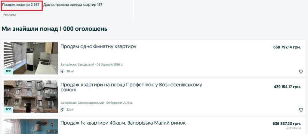 За її словами, пропозицій зараз багато: щодня на сайті OLX з’являється приблизно 80–100 нових оголошень. Квартири продають у всіх районах Запоріжжя, однак найбільшим попитом серед покупців користується саме правий берег міста, зокрема Бородинський мікрорайон. Часто вони обирають ці локації, оскільки вважають їх відносно безпечнішими.