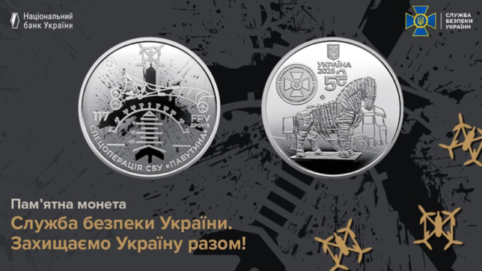 Служба безпеки України спільно з Національним банком презентували пам’ятну монету, присвячену спецоперації СБУ «Павутина». Номінал монети – 5 гривень, тираж – 75 тисяч штук у сувенірному пакуванні.