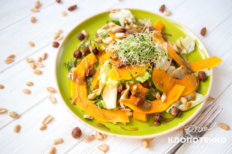 Грушу і гарбуз миємо і очищаємо від шкірки. Нарізаємо їх тонкими слайсами. Розігріваємо пательню з вершковим маслом. Обсмажуємо гарбуз з двох сторін протягом 1 хвилини. Після того, як обсмажили гарбуз, викладаємо його на паперовий рушник, щоб зайвий жир вбрався. Для соусу змішуємо гірчицю, соняшникову олію і бальзамічний оцет. У глибоку ємність викладаємо листя салату, додаємо грушу, листя м’яти, гарбуз, горіхи, поливаємо соусом, солимо і перемішуємо.