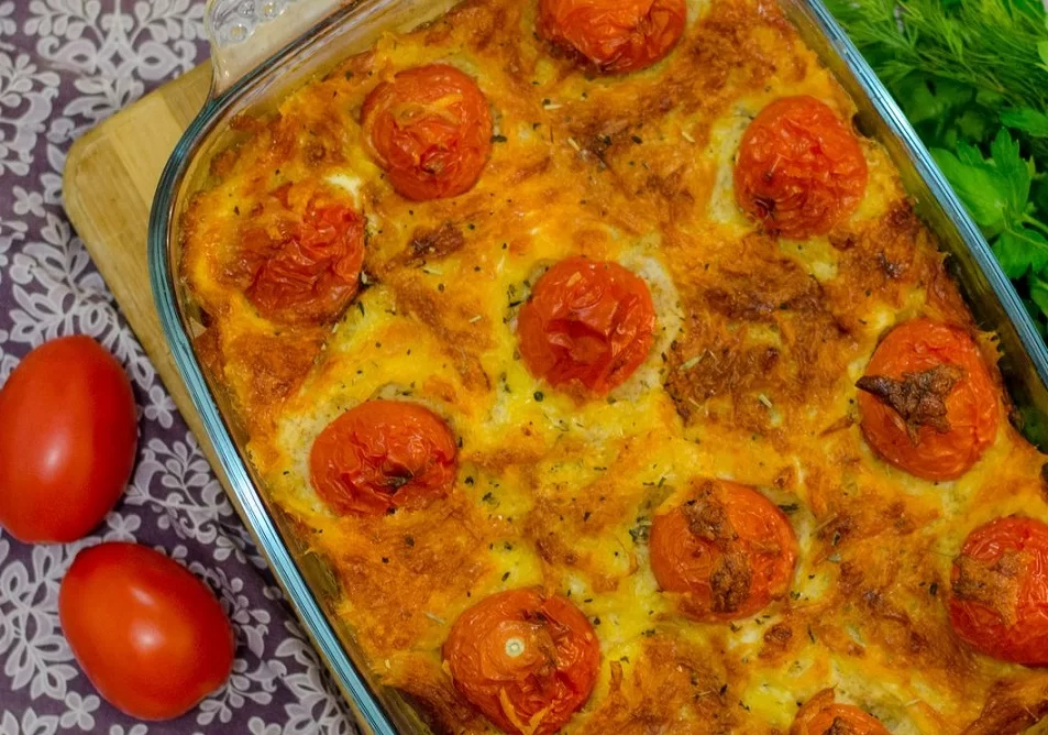 - У глибоку сковороду, змащену маслом, покладіть шар гарбуза, потім м’ясо з рисом, знову шар гарбуза, зверху викладіть помідори кружечками. Додайте трохи окропу або бульйону й тушкуйте в духовці під кришкою до готовності гарбуза.