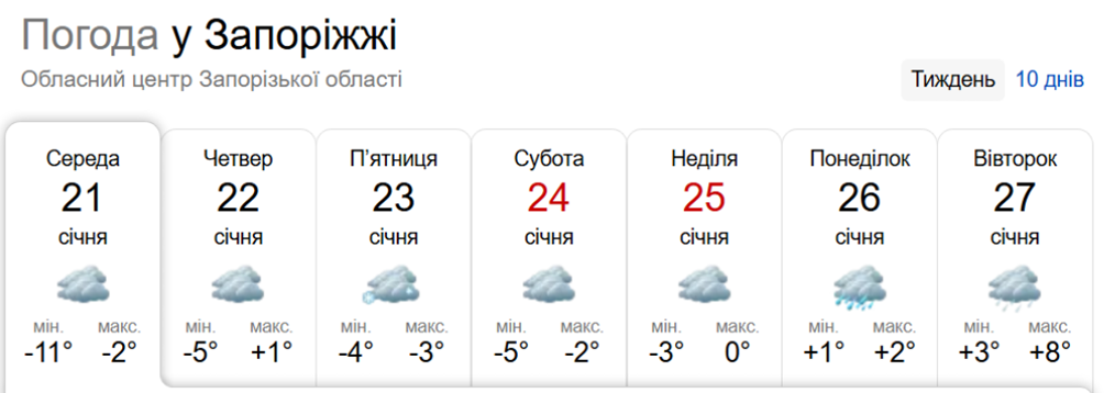 За даними Sinoptik.ua, найхолоднішим днем стане середа 21 січня, коли температура опуститься до -11°. Найтеплішими днями будуть 26 та 27 січня (понеділок та вівторок), коли максимальна температура сягне +8°.