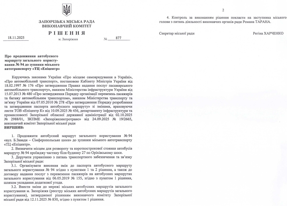 У Запоріжжі змінили схему руху автобусного маршруту №94. Відтепер він курсуватиме до зупинки біля ТЦ «Епіцентр» на Оріхівському шосе.