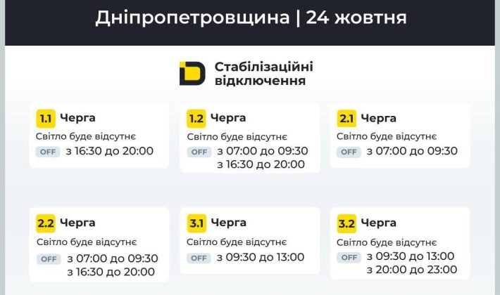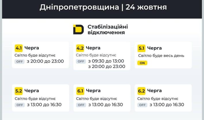 На Дніпропетровщині 24 жовтня частина районів отримала до двох відключень на день (здебільшого ранковий та вечірній пік). Не всі черги того дня вимикалися, а для тих, на кого поширилися обмеження, тривалість відключень становила переважно 2,5-4 години.