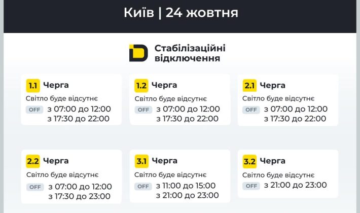 У Києві того дня режим був жорсткішим: більшість черг мали по два тривалі блоки — зранку та ввечері, по 4-5 годин кожен. Деякі підчерги були без світла до 23:00.