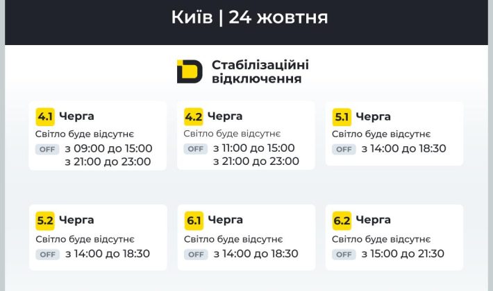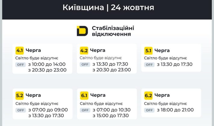 У Запорізькій області 24 жовтня відключення були відносно короткими — у більшості черг по два рази тривалістю від двох до трьох годин. Частина підчерг взагалі не вимикалася, а найдовші паузи фіксувалися вранці та ввечері.