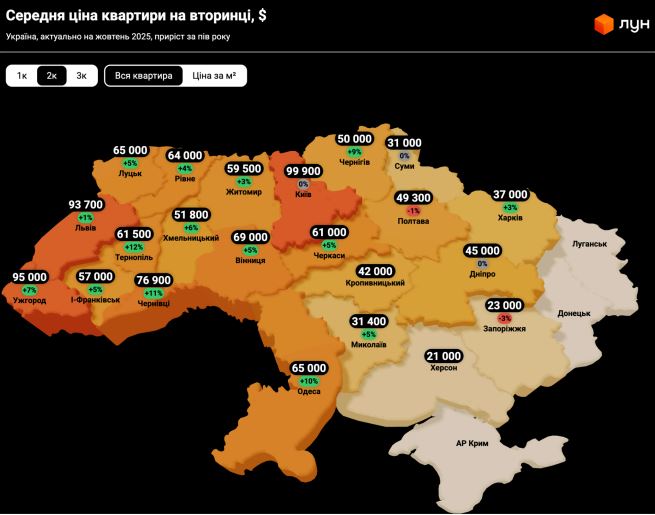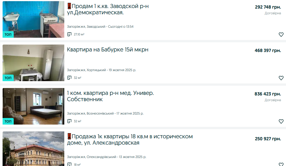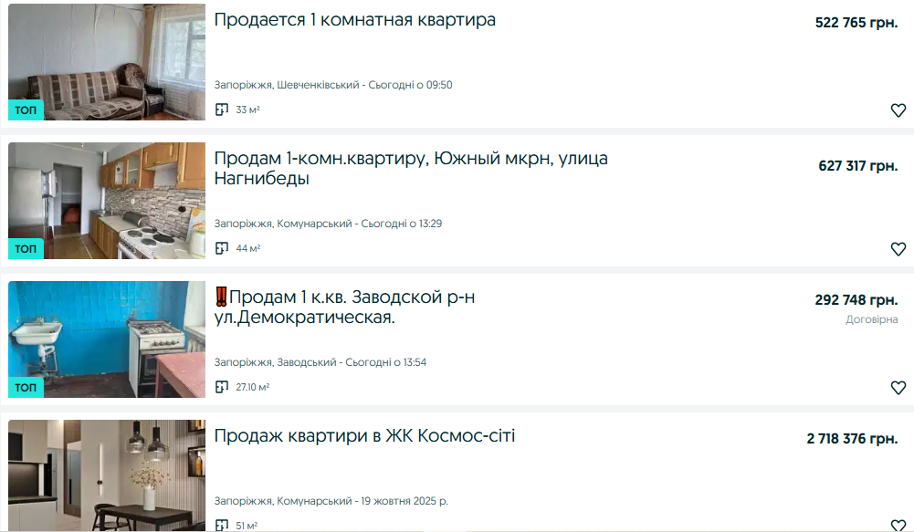 Ціни на купівлю житла в Україні зростають повільніше, ніж на оренду, але попит стабільно тримається. У жовтні 2025 року квадратний метр у Запоріжжі коштує в середньому 470-500 доларів США, а однокімнатну квартиру можна придбати від 16 000 доларів.