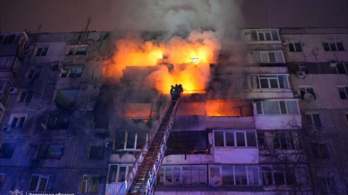 Під ранок росіяни атакували Запоріжжя безпілотником. «Шахед» влучив у багатоповерхівку, виникла пожежа на верхніх поверхах.