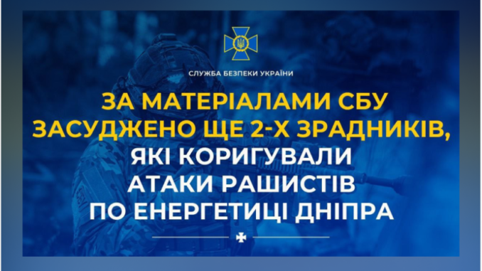 За доказовою базою Служби безпеки України суд визнав винними двох агентів фсб, які коригували повітряні атаки рф по об’єктах енергетичної інфраструктури Дніпра. Кожному з них призначено 15 років позбавлення волі з конфіскацією майна.